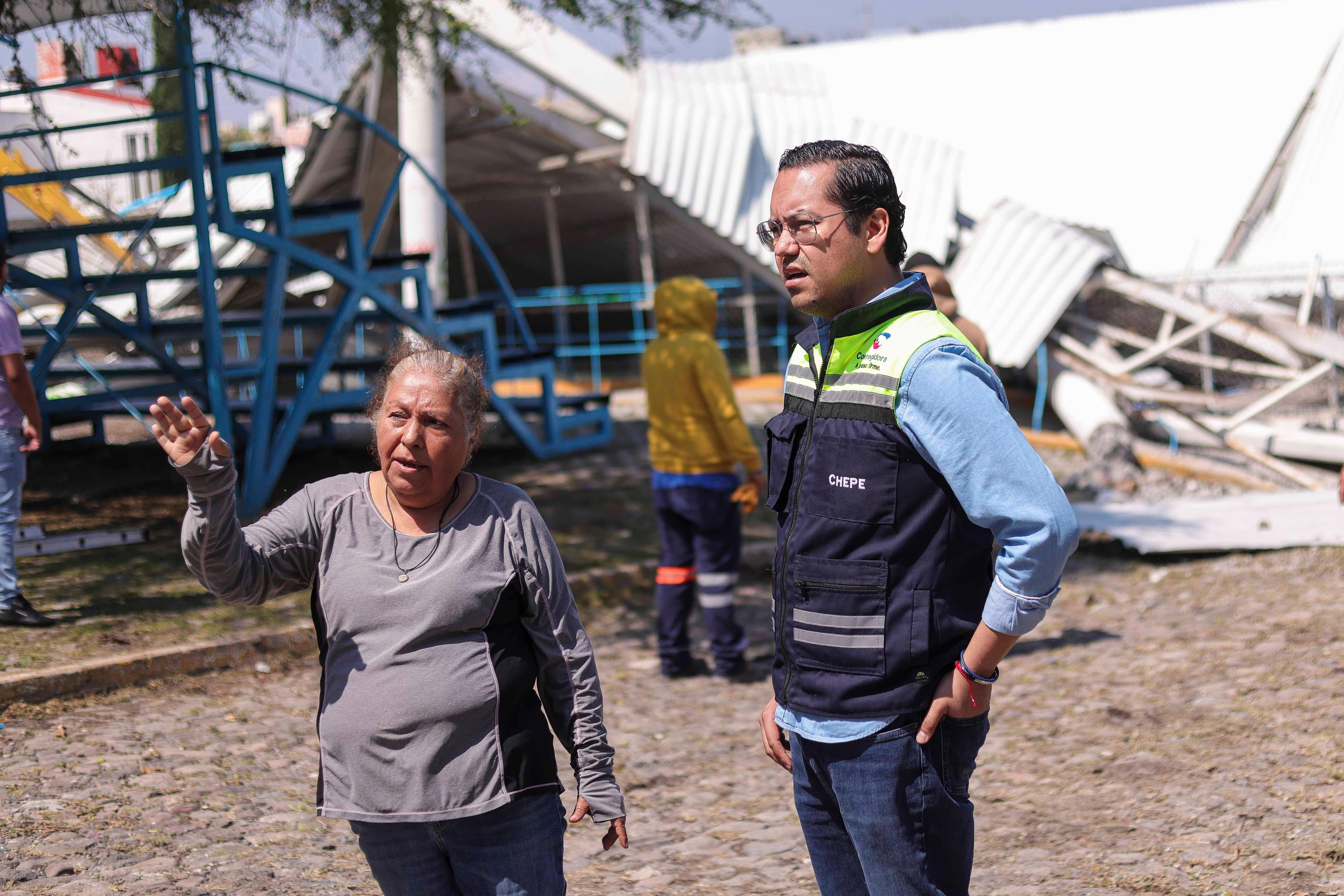 El presidente municipal de Corregidora, Chepe Guerrero, supervisó las labores de retiro de un arcotecho que colapsó tras los fuertes vientos y lluvias recientes en la demarcación.
